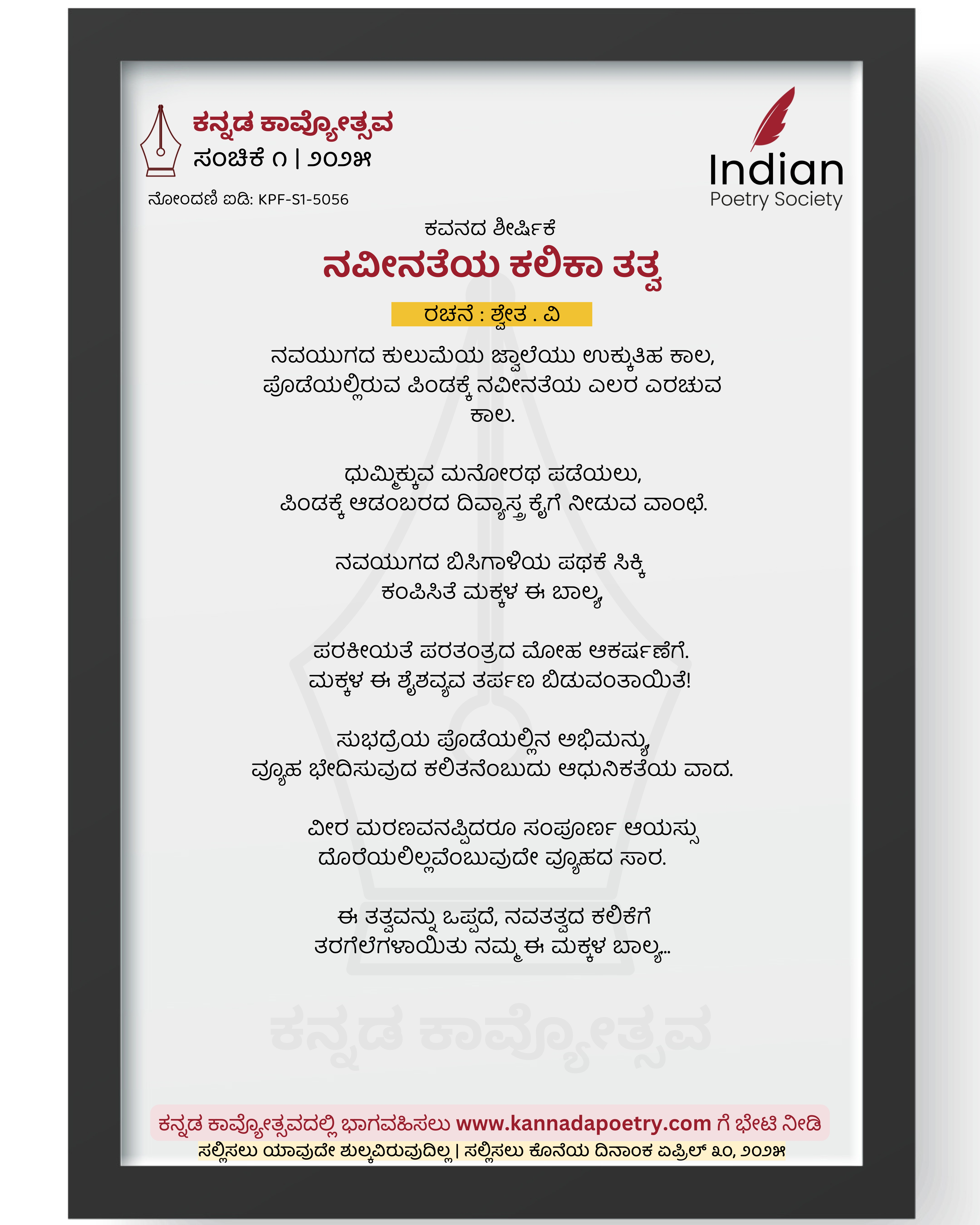 ನವಯುಗದ ಕುಲುಮೆಯ ಜ್ವಾಲೆಯು ಉಕ್ಕುತಿಹ ಕಾಲ, ಪೊಡೆಯಲ್ಲಿರುವ ಪಿಂಡಕ್ಕೆ ನವೀನತೆಯ ಎಲರ ಎರಚುವ ಕಾಲ. ಧುಮ್ಮಿಕ್ಕುವ ಮನೋರಥ ಪಡೆಯಲು, ಪಿಂಡಕ್ಕೆ ಆಡಂಬರದ ದಿವ್ಯಾಸ್ತ್ರ ಕೈಗೆ ನೀಡುವ ವಾಂಛೆ. ನವಯುಗದ ಬಿಸಿಗಾಳಿಯ ಪಥಕೆ ಸಿಕ್ಕಿ ಕಂಪಿಸಿತೆ ಮಕ್ಕಳ ಈ ಬಾಲ್ಯ, ಪರಕೀಯತೆ ಪರತಂತ್ರದ ಮೋಹ ಆಕರ್ಷಣೆಗೆ. ಮಕ್ಕಳ ಈ ಶೈಶವ್ಯವ ತರ್ಪಣ ಬಿಡುವಂತಾಯಿತೆ! ಸುಭದ್ರೆಯ ಪೊಡೆಯಲ್ಲಿನ ಅಭಿಮನ್ಯು, ವ್ಯೂಹ ಭೇದಿಸುವುದ ಕಲಿತನೆಂಬುದು ಆಧುನಿಕತೆಯ ವಾದ. ವೀರ ಮರಣವನಪ್ಪಿದರೂ ಸಂಪೂರ್ಣ ಆಯಸ್ಸು ದೊರೆಯಲಿಲ್ಲವೆಂಬುವುದೇ ವ್ಯೂಹದ ಸಾರ. ಈ ತತ್ವವನ್ನು ಒಪ್ಪದೆ, ನವತತ್ವದ ಕಲಿಕೆಗೆ ತರಗೆಲೆಗಳಾಯಿತು ನಮ್ಮ ಈ ಮಕ್ಕಳ ಬಾಲ್ಯ...