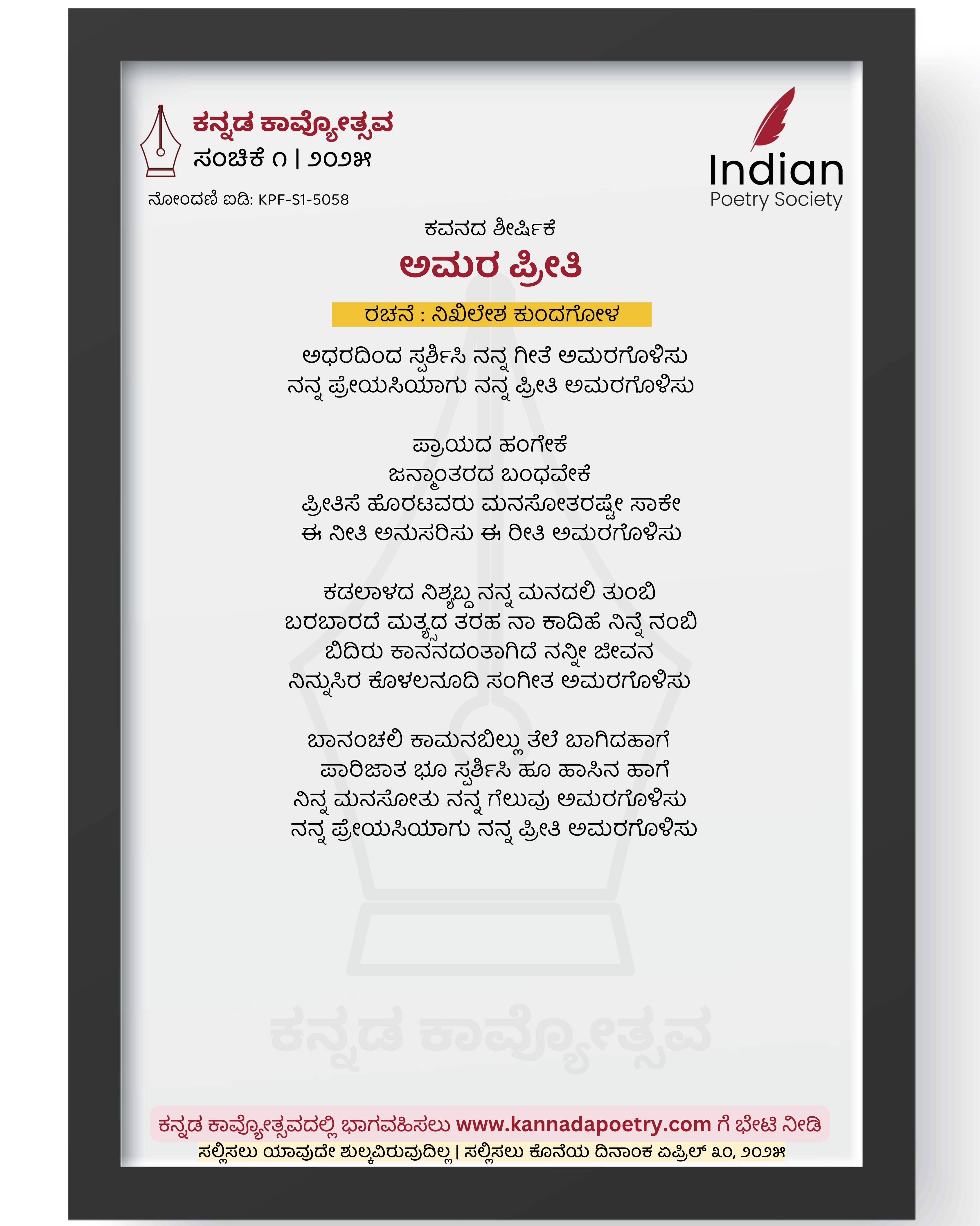 ಅಧರದಿಂದ ಸ್ಪರ್ಶಿಸಿ ನನ್ನ ಗೀತೆ ಅಮರಗೊಳಿಸು ನನ್ನ ಪ್ರೇಯಸಿಯಾಗು ನನ್ನ ಪ್ರೀತಿ ಅಮರಗೊಳಿಸು ಪ್ರಾಯದ ಹಂಗೇಕೆ ಜನ್ಮಾಂತರದ ಬಂಧವೇಕೆ ಪ್ರೀತಿಸೆ ಹೊರಟವರು ಮನಸೋತರಷ್ಟೇ ಸಾಕೇ ಈ ನೀತಿ ಅನುಸರಿಸು ಈ ರೀತಿ ಅಮರಗೊಳಿಸು ಕಡಲಾಳದ ನಿಶ್ಯಬ್ದ ನನ್ನ ಮನದಲಿ ತುಂಬಿ ಬರಬಾರದೆ ಮತ್ಯ್ಸದ ತರಹ ನಾ ಕಾದಿಹೆ ನಿನ್ನೆ ನಂಬಿ ಬಿದಿರು ಕಾನನದಂತಾಗಿದೆ ನನ್ನೀ ಜೀವನ ನಿನ್ನುಸಿರ ಕೊಳಲನೂದಿ ಸಂಗೀತ ಅಮರಗೊಳಿಸು ಬಾನಂಚಲಿ ಕಾಮನಬಿಲ್ಲು ತೆಲೆ ಬಾಗಿದಹಾಗೆ ಪಾರಿಜಾತ ಭೂ ಸ್ಪರ್ಶಿಸಿ ಹೂ ಹಾಸಿನ ಹಾಗೆ ನಿನ್ನ ಮನಸೋತು ನನ್ನ ಗೆಲುವು ಅಮರಗೊಳಿಸು ನನ್ನ ಪ್ರೇಯಸಿಯಾಗು ನನ್ನ ಪ್ರೀತಿ ಅಮರಗೊಳಿಸು