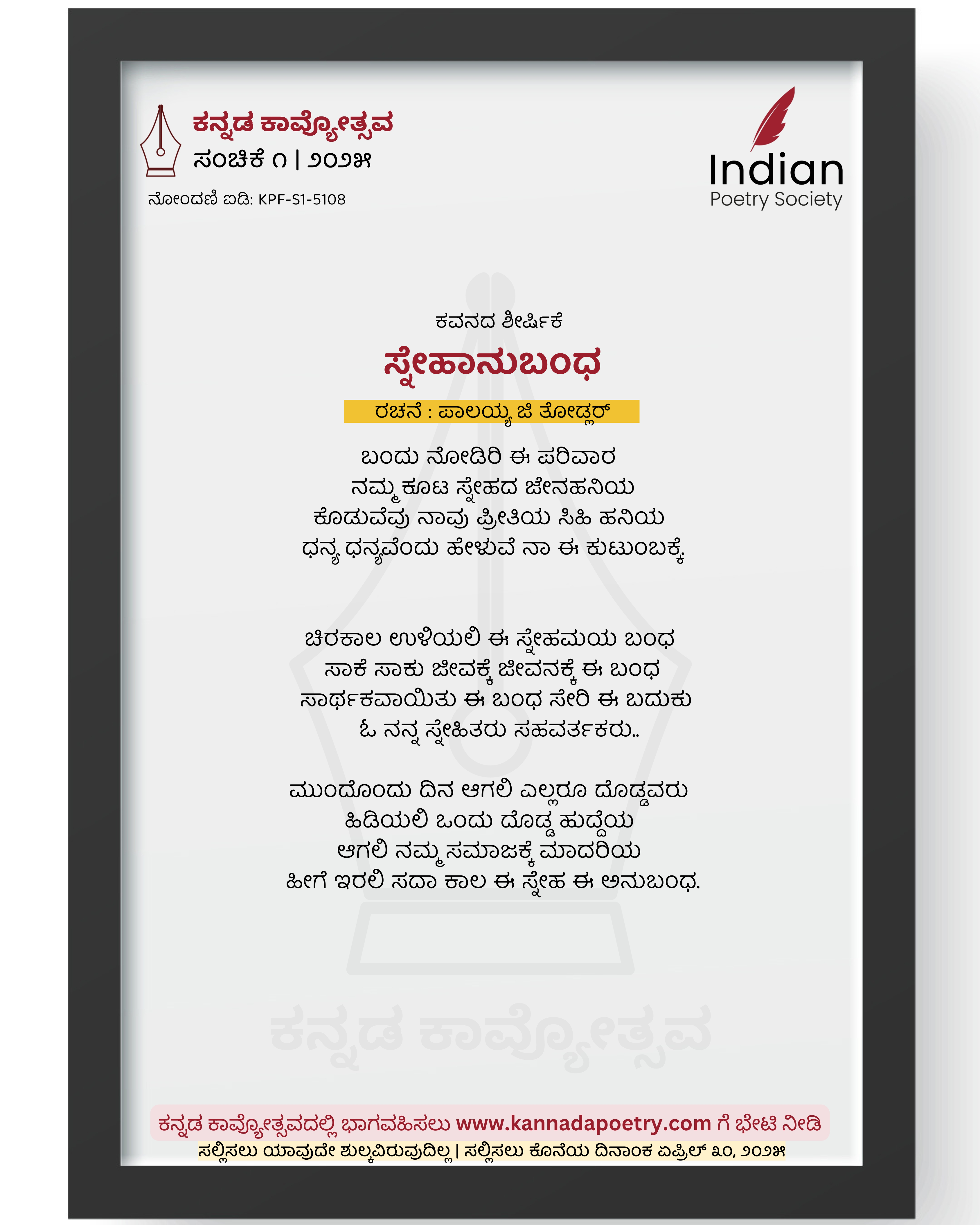 ಬಂದು ನೋಡಿರಿ ಈ ಪರಿವಾರ ನಮ್ಮ ಕೂಟ ಸ್ನೇಹದ ಜೇನಹನಿಯ ಕೊಡುವೆವು ನಾವು ಪ್ರೀತಿಯ ಸಿಹಿ ಹನಿಯ ಧನ್ಯ ಧನ್ಯವೆಂದು ಹೇಳುವೆ ನಾ ಈ ಕುಟುಂಬಕ್ಕೆ. ಚಿರಕಾಲ ಉಳಿಯಲಿ ಈ ಸ್ನೇಹಮಯ ಬಂಧ ಸಾಕೆ ಸಾಕು ಜೀವಕ್ಕೆ ಜೀವನಕ್ಕೆ ಈ ಬಂಧ ಸಾರ್ಥಕವಾಯಿತು ಈ ಬಂಧ ಸೇರಿ ಈ ಬದುಕು ಓ ನನ್ನ ಸ್ನೇಹಿತರು ಸಹವರ್ತಕರು.. ಮುಂದೊಂದು ದಿನ ಆಗಲಿ ಎಲ್ಲರೂ ದೊಡ್ಡವರು ಹಿಡಿಯಲಿ ಒಂದು ದೊಡ್ಡ ಹುದ್ದೆಯ ಆಗಲಿ ನಮ್ಮ ಸಮಾಜಕ್ಕೆ ಮಾದರಿಯ ಹೀಗೆ ಇರಲಿ ಸದಾ ಕಾಲ ಈ ಸ್ನೇಹ ಈ ಅನುಬಂಧ.