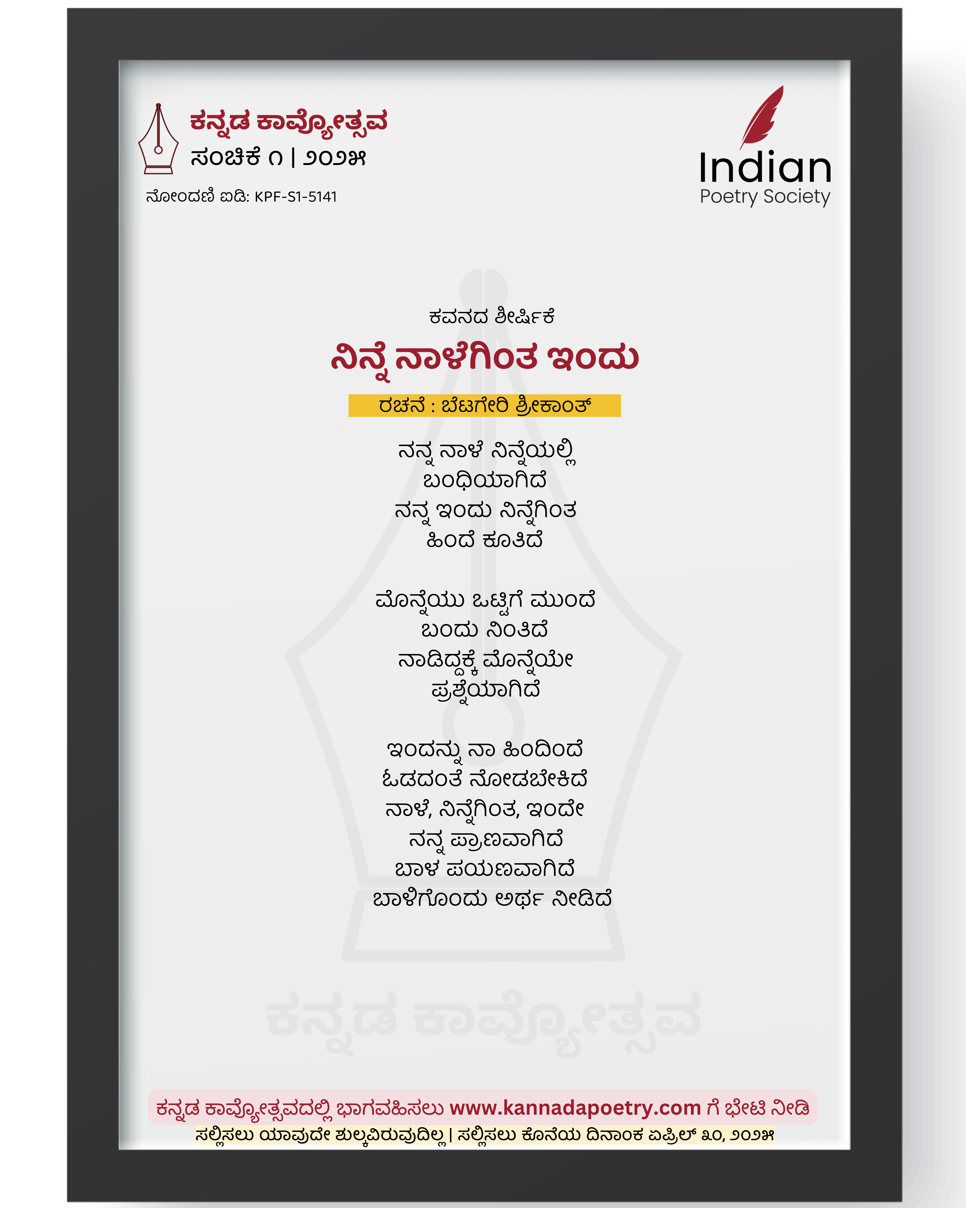 ನನ್ನ ನಾಳೆ ನಿನ್ನೆಯಲ್ಲಿ ಬಂಧಿಯಾಗಿದೆ ನನ್ನ ಇಂದು ನಿನ್ನೆಗಿಂತ ಹಿಂದೆ ಕೂತಿದೆ ಮೊನ್ನೆಯು ಒಟ್ಟಿಗೆ ಮುಂದೆ ಬಂದು ನಿಂತಿದೆ ನಾಡಿದ್ದಕ್ಕೆ ಮೊನ್ನೆಯೇ ಪ್ರಶ್ನೆಯಾಗಿದೆ ಇಂದನ್ನು ನಾ ಹಿಂದಿಂದೆ ಓಡದಂತೆ ನೋಡಬೇಕಿದೆ ನಾಳೆ, ನಿನ್ನೆಗಿಂತ, ಇಂದೇ ನನ್ನ ಪ್ರಾಣವಾಗಿದೆ ಬಾಳ ಪಯಣವಾಗಿದೆ ಬಾಳಿಗೊಂದು ಅರ್ಥ ನೀಡಿದೆ