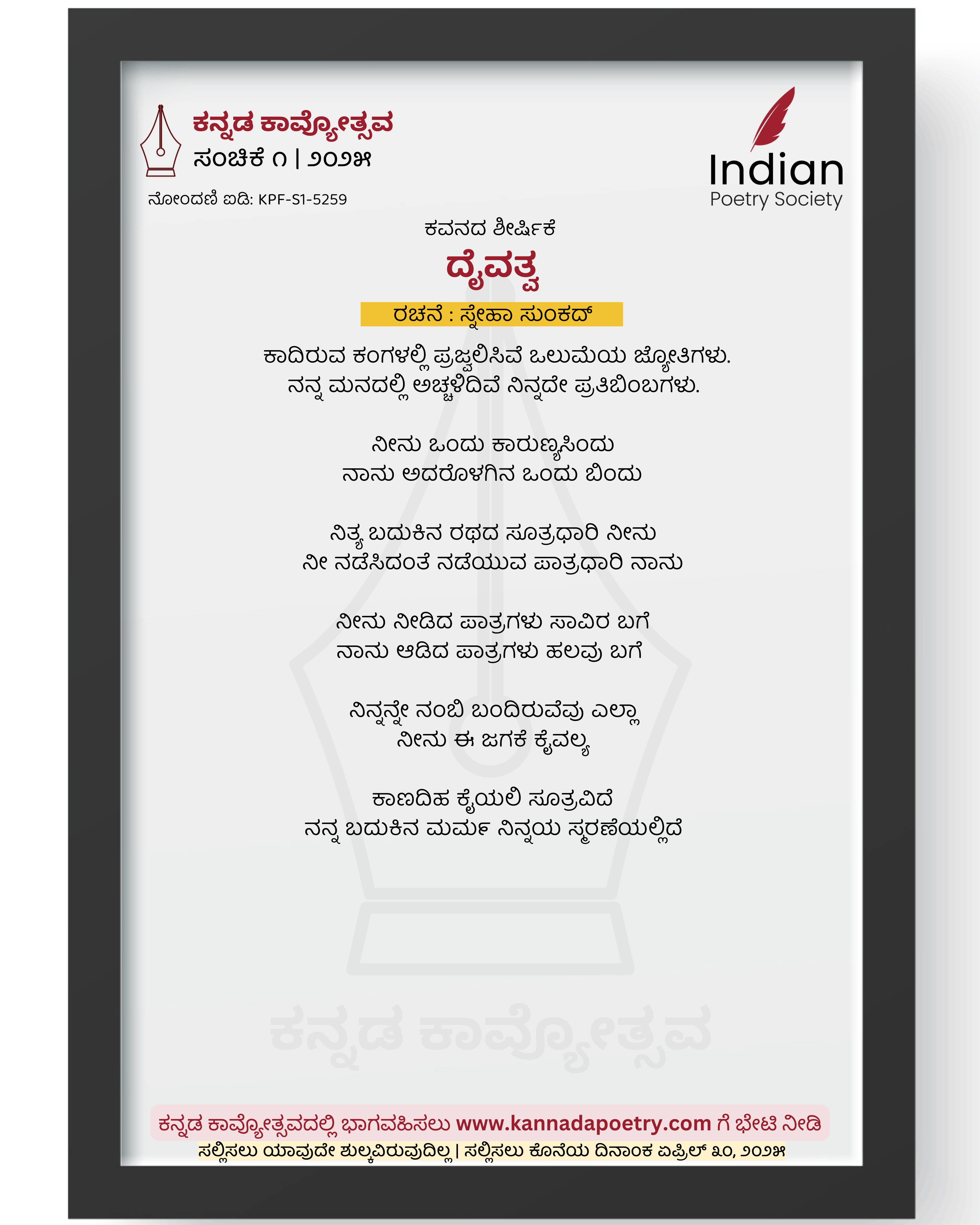 ಕಾದಿರುವ ಕಂಗಳಲ್ಲಿ ಪ್ರಜ್ವಲಿಸಿವೆ ಒಲುಮೆಯ ಜ್ಯೋತಿಗಳು. ನನ್ನ ಮನದಲ್ಲಿ ಅಚ್ಚಳಿದಿವೆ ನಿನ್ನದೇ ಪ್ರತಿಬಿಂಬಗಳು. ನೀನು ಒಂದು ಕಾರುಣ್ಯಸಿಂದು ನಾನು ಅದರೊಳಗಿನ ಒಂದು ಬಿಂದು ನಿತ್ಯ ಬದುಕಿನ ರಥದ ಸೂತ್ರಧಾರಿ ನೀನು ನೀ ನಡೆಸಿದಂತೆ ನಡೆಯುವ ಪಾತ್ರಧಾರಿ ನಾನು ನೀನು ನೀಡಿದ ಪಾತ್ರಗಳು ಸಾವಿರ ಬಗೆ ನಾನು ಆಡಿದ ಪಾತ್ರಗಳು ಹಲವು ಬಗೆ ನಿನ್ನನ್ನೇ ನಂಬಿ ಬಂದಿರುವೆವು ಎಲ್ಲಾ ನೀನು ಈ ಜಗಕೆ ಕೈವಲ್ಯ ಕಾಣದಿಹ ಕೈಯಲಿ ಸೂತ್ರವಿದೆ ನನ್ನ ಬದುಕಿನ ಮಮ೯ ನಿನ್ನಯ ಸ್ಮರಣೆಯಲ್ಲಿದೆ