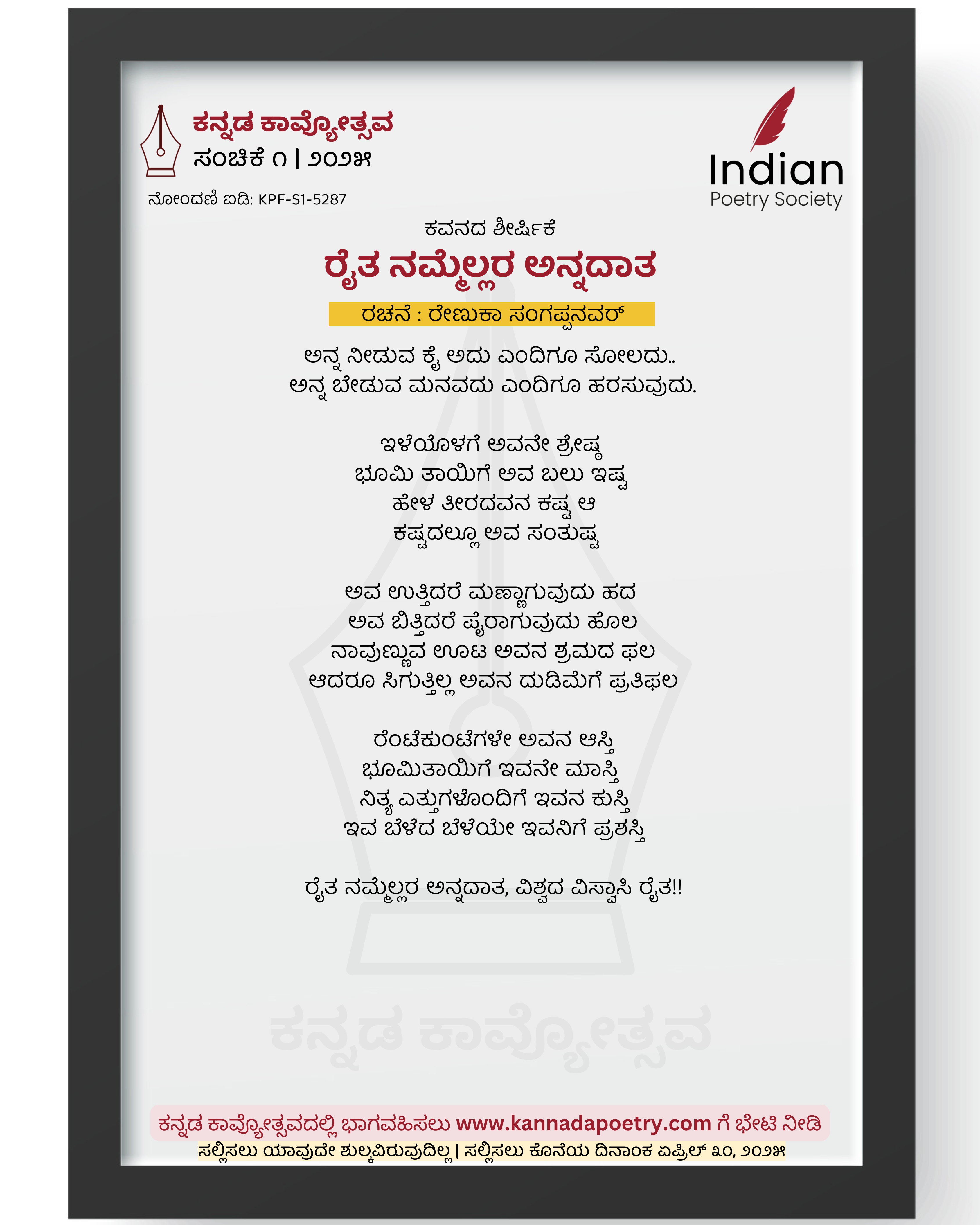 ಅನ್ನ ನೀಡುವ ಕೈ ಅದು ಎಂದಿಗೂ ಸೋಲದು.. ಅನ್ನ ಬೇಡುವ ಮನವದು ಎಂದಿಗೂ ಹರಸುವುದು. ಇಳೆಯೊಳಗೆ ಅವನೇ ಶ್ರೇಷ್ಠ ಭೂಮಿ ತಾಯಿಗೆ ಅವ ಬಲು ಇಷ್ಟ ಹೇಳ ತೀರದವನ ಕಷ್ಟ ಆ ಕಷ್ಟದಲ್ಲೂ ಅವ ಸಂತುಷ್ಟ ಅವ ಉತ್ತಿದರೆ ಮಣ್ಣಾಗುವುದು ಹದ ಅವ ಬಿತ್ತಿದರೆ ಪೈರಾಗುವುದು ಹೊಲ ನಾವುಣ್ಣುವ ಊಟ ಅವನ ಶ್ರಮದ ಫಲ ಆದರೂ ಸಿಗುತ್ತಿಲ್ಲ ಅವನ ದುಡಿಮೆಗೆ ಪ್ರತಿಫಲ ರೆಂಟೆಕುಂಟೆಗಳೇ ಅವನ ಆಸ್ತಿ ಭೂಮಿತಾಯಿಗೆ ಇವನೇ ಮಾಸ್ತಿ ನಿತ್ಯ ಎತ್ತುಗಳೊಂದಿಗೆ ಇವನ ಕುಸ್ತಿ ಇವ ಬೆಳೆದ ಬೆಳೆಯೇ ಇವನಿಗೆ ಪ್ರಶಸ್ತಿ ರೈತ ನಮ್ಮೆಲ್ಲರ ಅನ್ನದಾತ, ವಿಶ್ವದ ವಿಸ್ವಾಸಿ ರೈತ!!