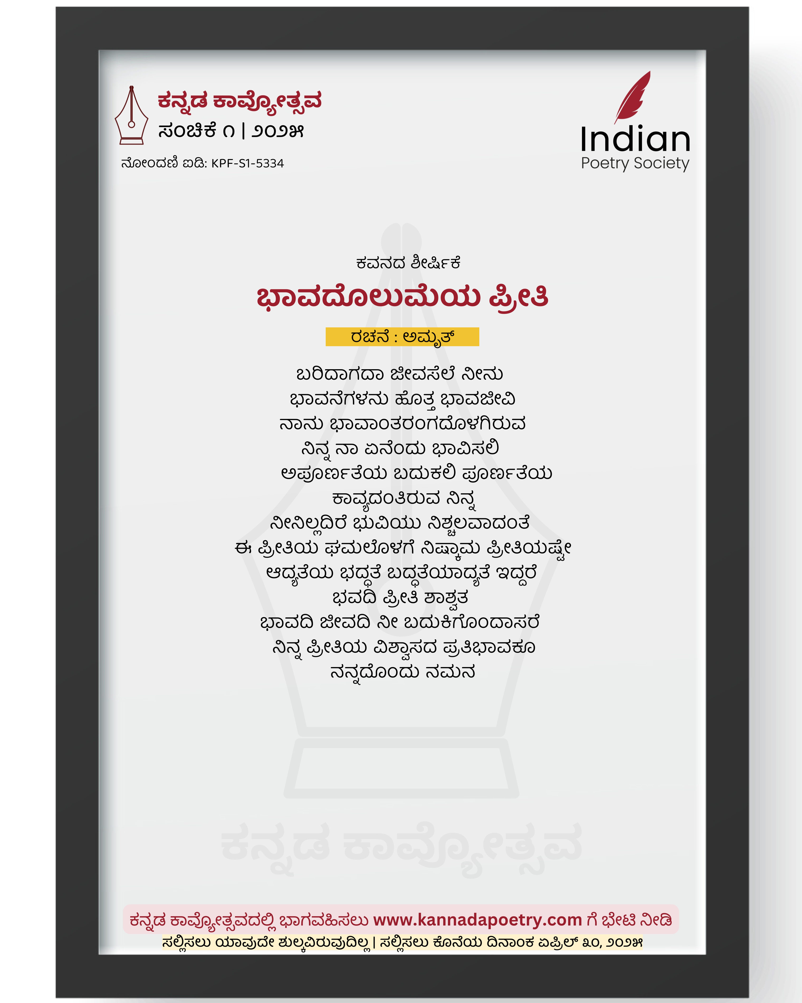 ಬರಿದಾಗದಾ ಜೀವಸೆಲೆ ನೀನು ಭಾವನೆಗಳನು ಹೊತ್ತ ಭಾವಜೀವಿ ನಾನು ಭಾವಾಂತರಂಗದೊಳಗಿರುವ ನಿನ್ನ ನಾ ಏನೆಂದು ಭಾವಿಸಲಿ ಅಪೂರ್ಣತೆಯ ಬದುಕಲಿ ಪೂರ್ಣತೆಯ ಕಾವ್ಯದಂತಿರುವ ನಿನ್ನ ನೀನಿಲ್ಲದಿರೆ ಭುವಿಯು ನಿಶ್ಚಲವಾದಂತೆ ಈ ಪ್ರೀತಿಯ ಘಮಲೊಳಗೆ ನಿಷ್ಕಾಮ ಪ್ರೀತಿಯಷ್ಟೇ ಆದ್ಯತೆಯ ಭದ್ಧತೆ ಬದ್ಧತೆಯಾದ್ಯತೆ ಇದ್ದರೆ ಭವದಿ ಪ್ರೀತಿ ಶಾಶ್ವತ ಭಾವದಿ ಜೀವದಿ ನೀ ಬದುಕಿಗೊಂದಾಸರೆ ನಿನ್ನ ಪ್ರೀತಿಯ ವಿಶ್ವಾಸದ ಪ್ರತಿಭಾವಕೂ ನನ್ನದೊಂದು ನಮನ
