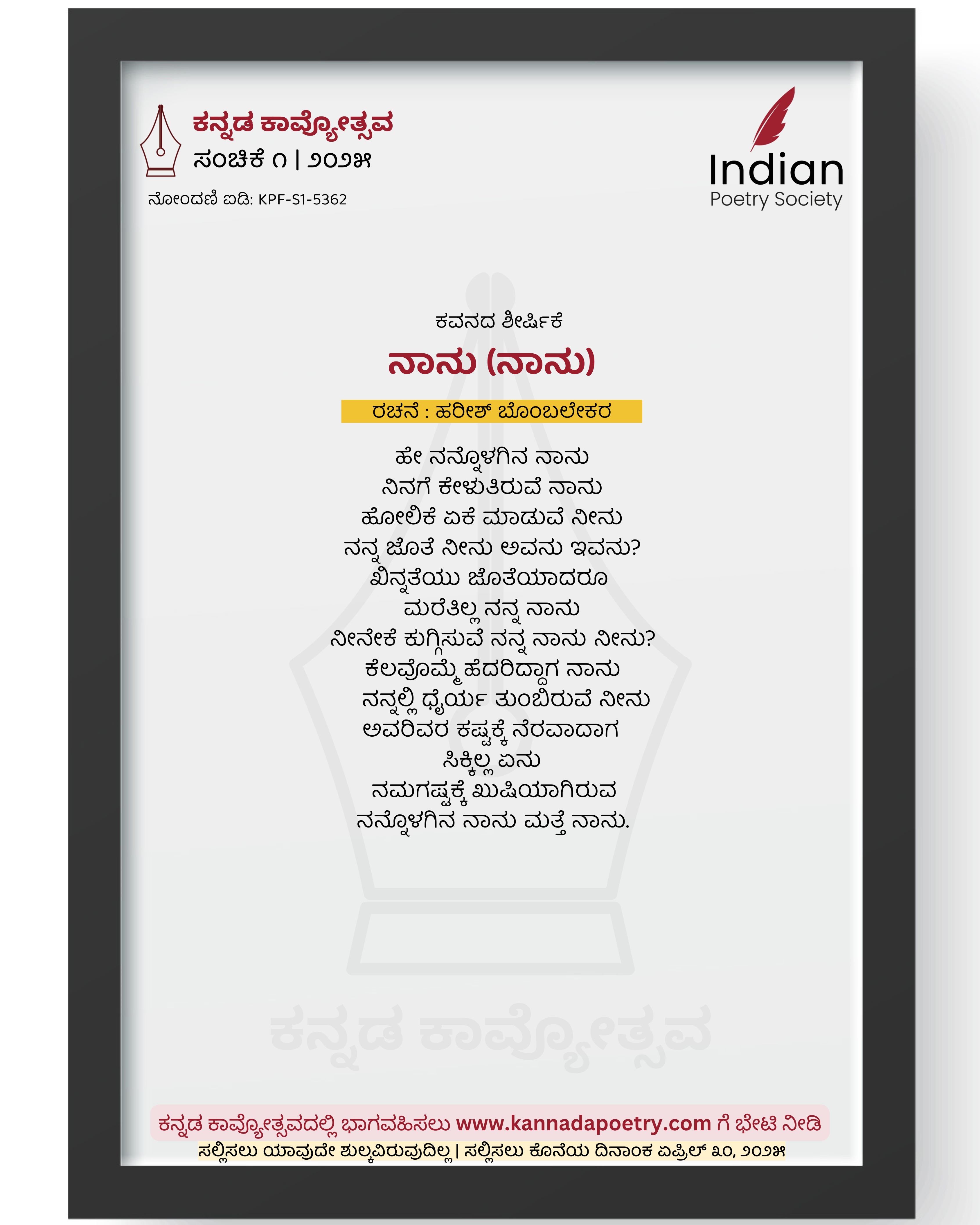 ಹೇ ನನ್ನೊಳಗಿನ ನಾನು ನಿನಗೆ ಕೇಳುತಿರುವೆ ನಾನು ಹೋಲಿಕೆ ಏಕೆ ಮಾಡುವೆ ನೀನು ನನ್ನ ಜೊತೆ ನೀನು ಅವನು ಇವನು? ಖಿನ್ನತೆಯು ಜೊತೆಯಾದರೂ ಮರೆತಿಲ್ಲ ನನ್ನ ನಾನು ನೀನೇಕೆ ಕುಗ್ಗಿಸುವೆ ನನ್ನ ನಾನು ನೀನು? ಕೆಲವೊಮ್ಮೆ ಹೆದರಿದ್ದಾಗ ನಾನು ನನ್ನಲ್ಲಿ ಧೈರ್ಯ ತುಂಬಿರುವೆ ನೀನು ಅವರಿವರ ಕಷ್ಟಕ್ಕೆ ನೆರವಾದಾಗ ಸಿಕ್ಕಿಲ್ಲ ಏನು ನಮಗಷ್ಟಕ್ಕೆ ಖುಷಿಯಾಗಿರುವ ನನ್ನೊಳಗಿನ ನಾನು ಮತ್ತೆ ನಾನು.