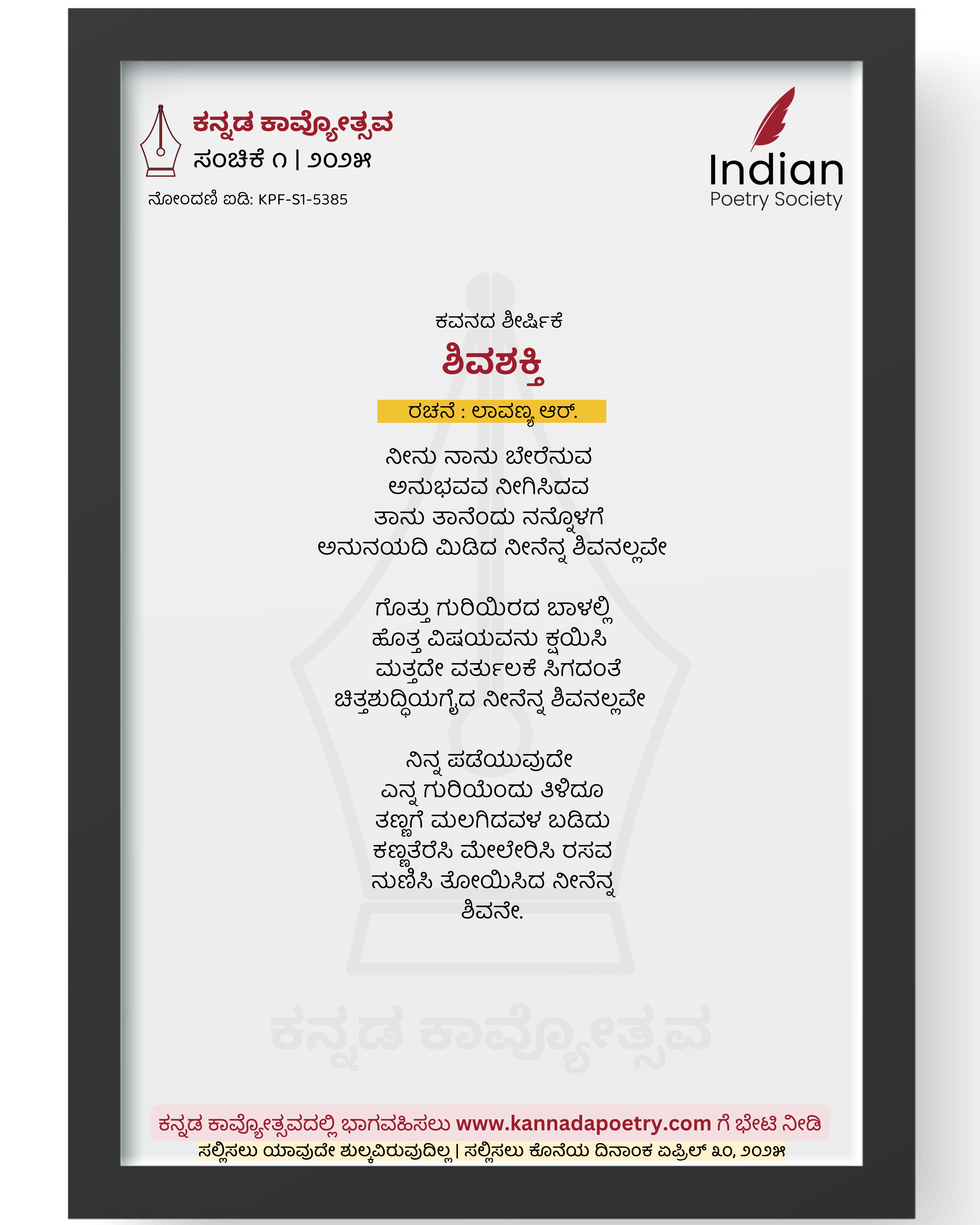 ನೀನು ನಾನು ಬೇರೆನುವ ಅನುಭವವ ನೀಗಿಸಿದವ ತಾನು ತಾನೆಂದು ನನ್ನೊಳಗೆ ಅನುನಯದಿ ಮಿಡಿದ ನೀನೆನ್ನ ಶಿವನಲ್ಲವೇ ಗೊತ್ತು ಗುರಿಯಿರದ ಬಾಳಲ್ಲಿ ಹೊತ್ತ ವಿಷಯವನು ಕ್ಷಯಿಸಿ ಮತ್ತದೇ ವರ್ತುಲಕೆ ಸಿಗದಂತೆ ಚಿತ್ತಶುದ್ಧಿಯಗೈದ ನೀನೆನ್ನ ಶಿವನಲ್ಲವೇ ನಿನ್ನ ಪಡೆಯುವುದೇ ಎನ್ನ ಗುರಿಯೆಂದು ತಿಳಿದೂ ತಣ್ಣಗೆ ಮಲಗಿದವಳ ಬಡಿದು ಕಣ್ಣತೆರೆಸಿ ಮೇಲೇರಿಸಿ ರಸವ ನುಣಿಸಿ ತೋಯಿಸಿದ ನೀನೆನ್ನ ಶಿವನೇ.