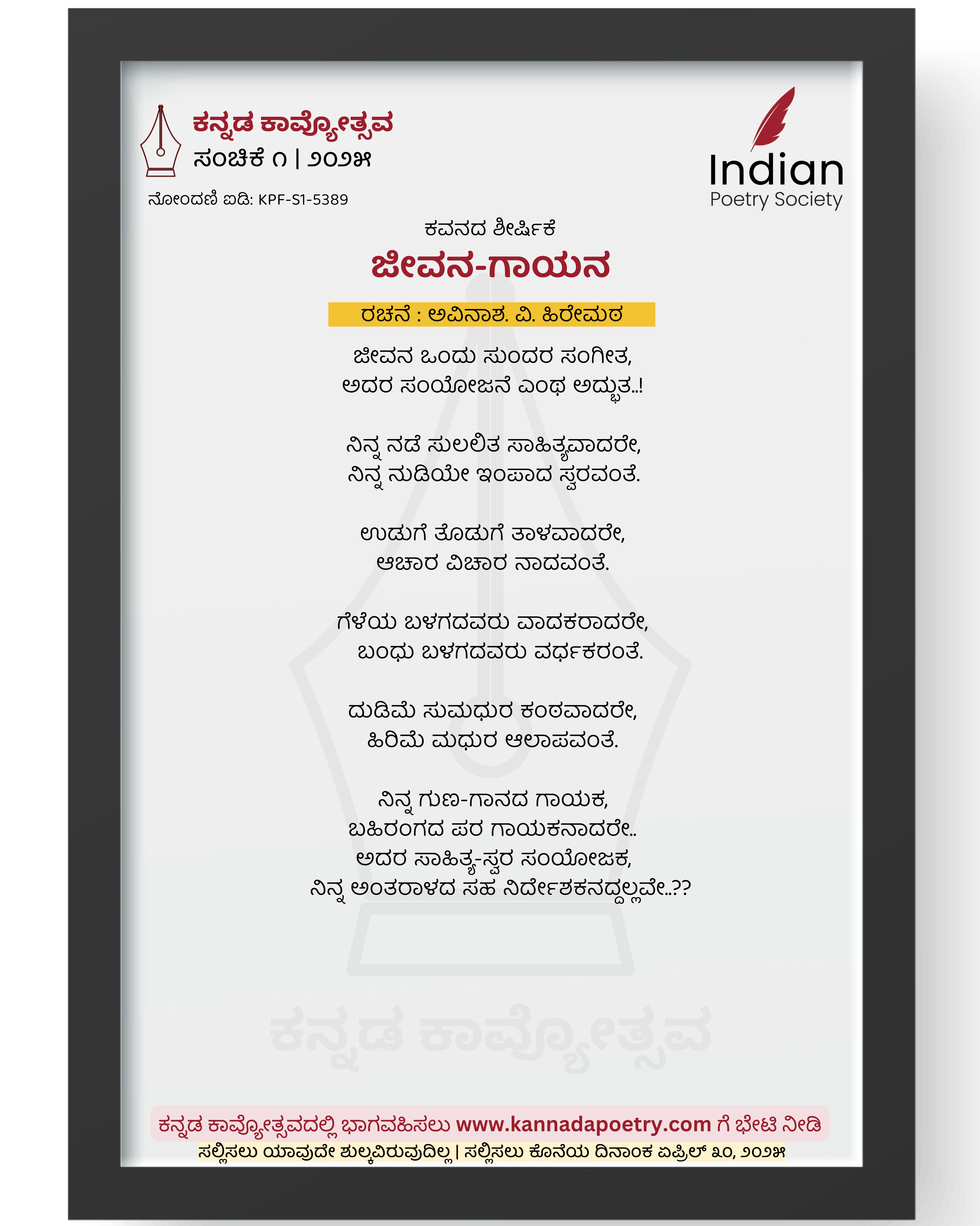 ಜೀವನ ಒಂದು ಸುಂದರ ಸಂಗೀತ, ಅದರ ಸಂಯೋಜನೆ ಎಂಥ ಅದ್ಭುತ..! ನಿನ್ನ ನಡೆ ಸುಲಲಿತ ಸಾಹಿತ್ಯವಾದರೇ, ನಿನ್ನ ನುಡಿಯೇ ಇಂಪಾದ ಸ್ವರವಂತೆ. ಉಡುಗೆ ತೊಡುಗೆ ತಾಳವಾದರೇ, ಆಚಾರ ವಿಚಾರ ನಾದವಂತೆ. ಗೆಳೆಯ ಬಳಗದವರು ವಾದಕರಾದರೇ, ಬಂಧು ಬಳಗದವರು ವರ್ಧಕರಂತೆ. ದುಡಿಮೆ ಸುಮಧುರ ಕಂಠವಾದರೇ, ಹಿರಿಮೆ ಮಧುರ ಆಲಾಪವಂತೆ. ನಿನ್ನ ಗುಣ-ಗಾನದ ಗಾಯಕ, ಬಹಿರಂಗದ ಪರ ಗಾಯಕನಾದರೇ.. ಅದರ ಸಾಹಿತ್ಯ-ಸ್ವರ ಸಂಯೋಜಕ, ನಿನ್ನ ಅಂತರಾಳದ ಸಹ ನಿರ್ದೇಶಕನದ್ದಲ್ಲವೇ..??