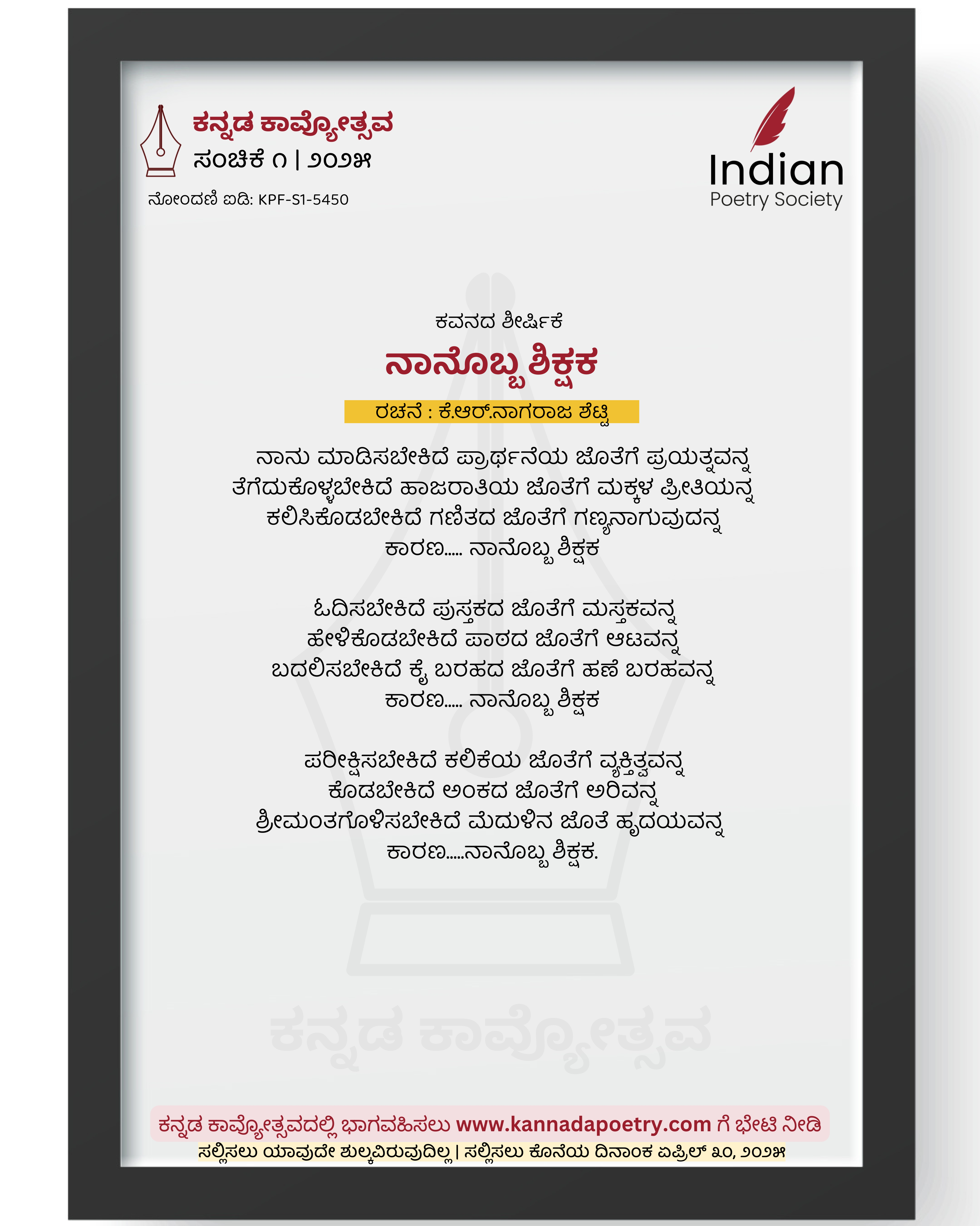 ನಾನು ಮಾಡಿಸಬೇಕಿದೆ ಪ್ರಾರ್ಥನೆಯ ಜೊತೆಗೆ ಪ್ರಯತ್ನವನ್ನ ತೆಗೆದುಕೊಳ್ಳಬೇಕಿದೆ ಹಾಜರಾತಿಯ ಜೊತೆಗೆ ಮಕ್ಕಳ ಪ್ರೀತಿಯನ್ನ ಕಲಿಸಿಕೊಡಬೇಕಿದೆ ಗಣಿತದ ಜೊತೆಗೆ ಗಣ್ಯನಾಗುವುದನ್ನ ಕಾರಣ..... ನಾನೊಬ್ಬ ಶಿಕ್ಷಕ ಓದಿಸಬೇಕಿದೆ ಪುಸ್ತಕದ ಜೊತೆಗೆ ಮಸ್ತಕವನ್ನ ಹೇಳಿಕೊಡಬೇಕಿದೆ ಪಾಠದ ಜೊತೆಗೆ ಆಟವನ್ನ ಬದಲಿಸಬೇಕಿದೆ ಕೈ ಬರಹದ ಜೊತೆಗೆ ಹಣೆ ಬರಹವನ್ನ ಕಾರಣ..... ನಾನೊಬ್ಬ ಶಿಕ್ಷಕ ಪರೀಕ್ಷಿಸಬೇಕಿದೆ ಕಲಿಕೆಯ ಜೊತೆಗೆ ವ್ಯಕ್ತಿತ್ವವನ್ನ ಕೊಡಬೇಕಿದೆ ಅಂಕದ ಜೊತೆಗೆ ಅರಿವನ್ನ ಶ್ರೀಮಂತಗೊಳಿಸಬೇಕಿದೆ ಮೆದುಳಿನ ಜೊತೆ ಹೃದಯವನ್ನ ಕಾರಣ.....ನಾನೊಬ್ಬ ಶಿಕ್ಷಕ.